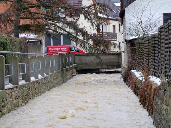 Von Baad her kommend hatte sich das Wasser über die Sportplätze und das Freibadgelände seinen Weg auf die Straßen gebahnt. Es wurden Keller mit Sandsäcken gesichert, vorallem Gullys freigelegt und Schneehaufen beseitigt, um das Wasser schneller abfließen zu lassen. Auch der Brandbachgarten war komplett überflutet, sodass der ev. Kindergarten gesichert werden musste. FFW Vorstand Erber konnte sich nicht erinnern, jemals so viel Wasser innerorts gesehen zu haben. Gottseidank hörte der starke Regen in der Nacht auf.