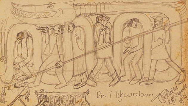 Die Geschichte der "Sieben Schwaben" benennt eine reale Volksgruppe (so wie es typisch ist für eine Sage), sie ist jedoch auch im Grimmschen Märchenbuch aufgeführt und genau genommen als Schwank zu betrachten. Der gebürtige Schwabe Müller identifiziert sich zum einen mit den "tapferen Schwaben", die im Mittelalter in erster Reihe die Reichssturmfahne trugen, amüsiert sich aber auch zeichnerisch über die "dummen Schwaben" die vor einem Ungeheuer Angst haben, das sich als Hase herausstellt.