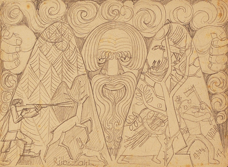 Müller wandte sich diesem Thema wiederholt zu, nicht Text getreu, sondern interpretierend. In der auf dem Ausstellungsplakat zu sehenden Zeichnung, vermischt sich das Motiv mit der Schlussszene des Rapunzelmärchens. Eine weitere Brüderchen u. Schwesterchen-Version betitelt der Künstler gleich als "Romanze" und in der Schneewittchen-Zeichnung (7 Zwerge) schafft er eine Melange mit Dornröschen.