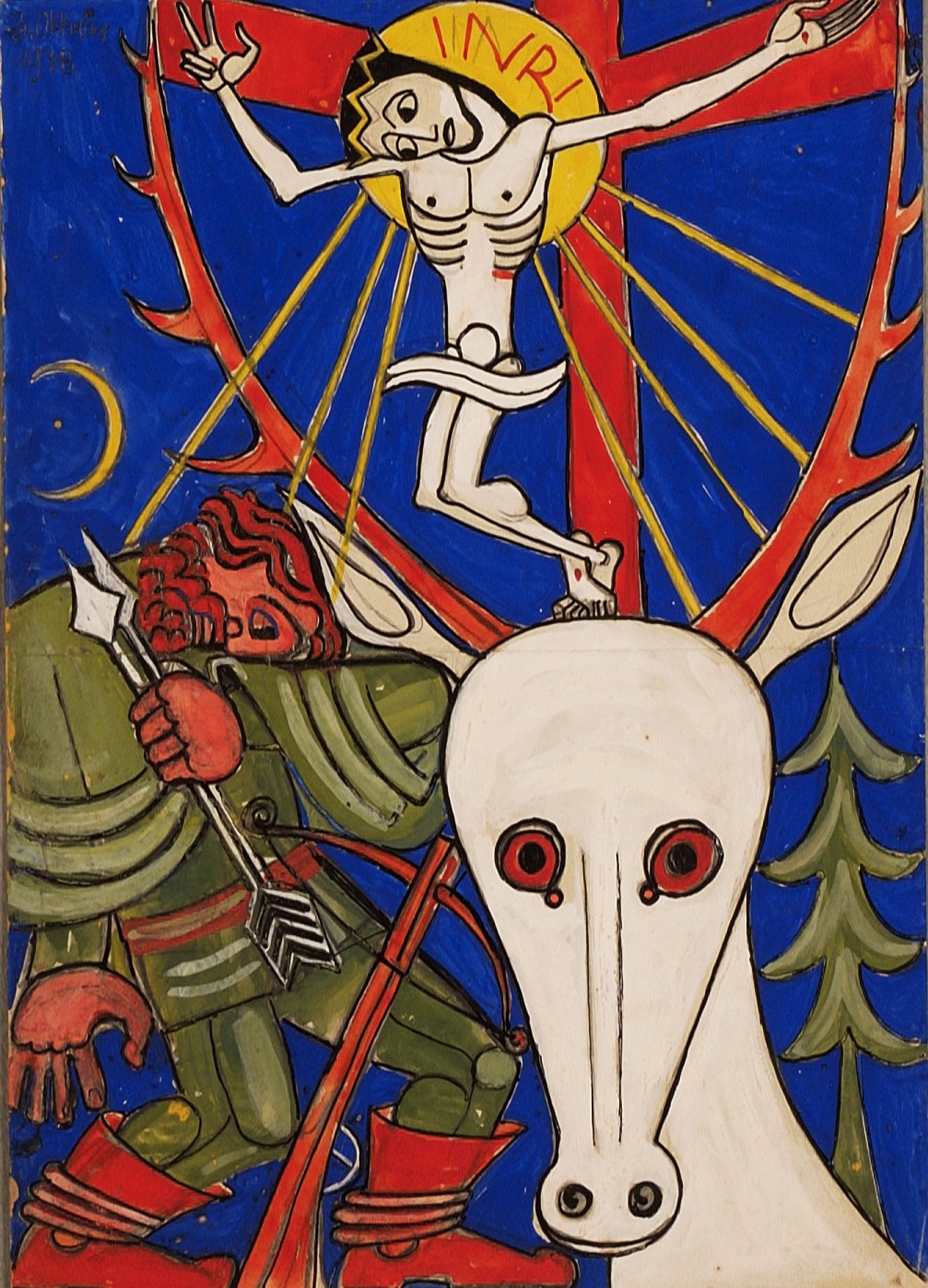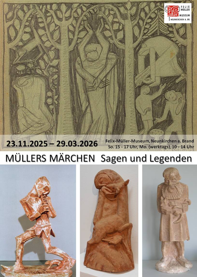 Auf das Genre der Legenden (Heiligengeschichten) schließlich verweisen u. a. zwei Leihgaben: eine anmutige Holzskulptur, welche die Hubertuslegende darstellt und das große farbige Christophorus-Relief aus dem Neunkirchener Kindergarten St. Elisabeth. Mit beiden Heiligen befasste sich Felix Müller vielfach.