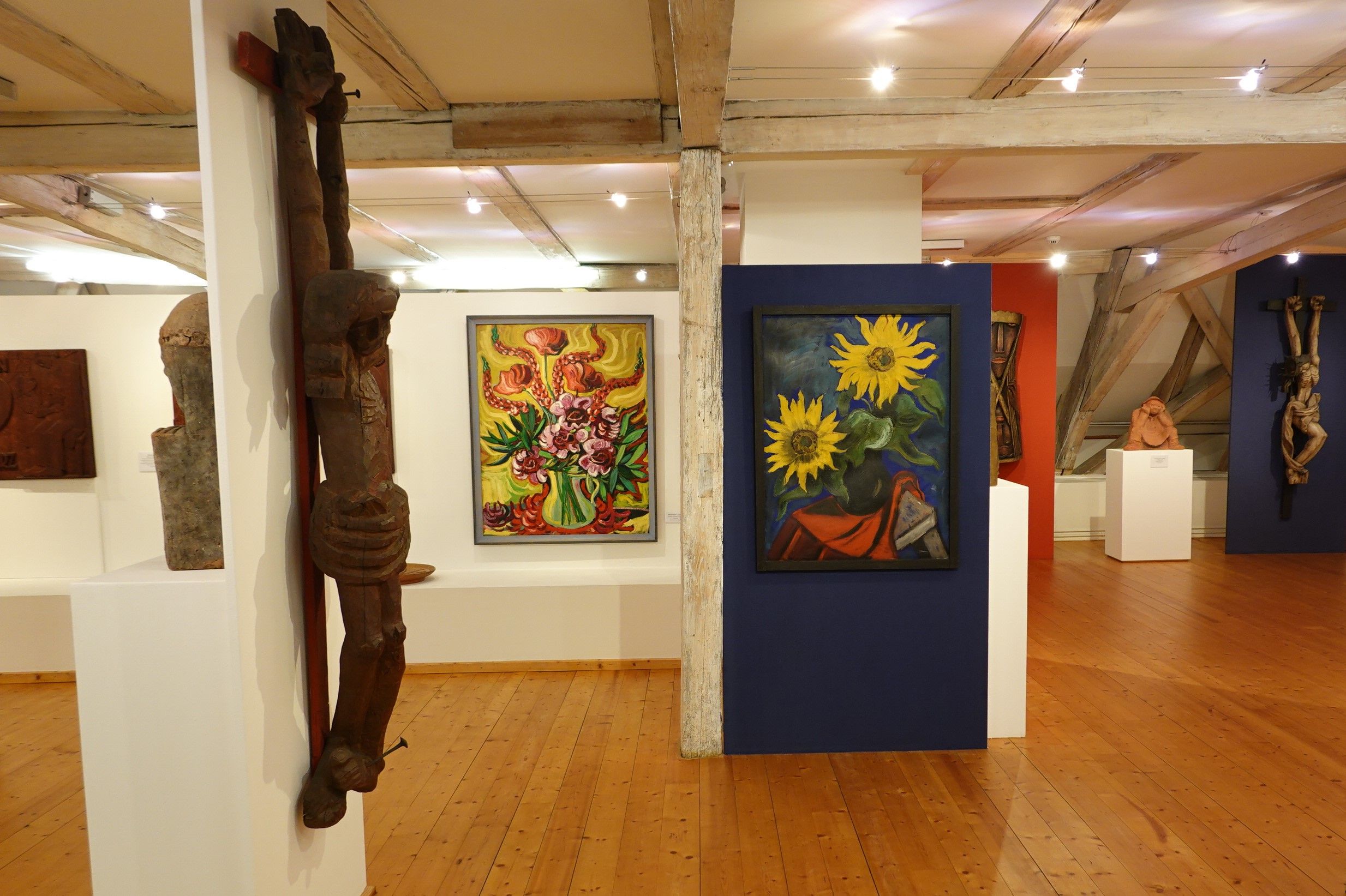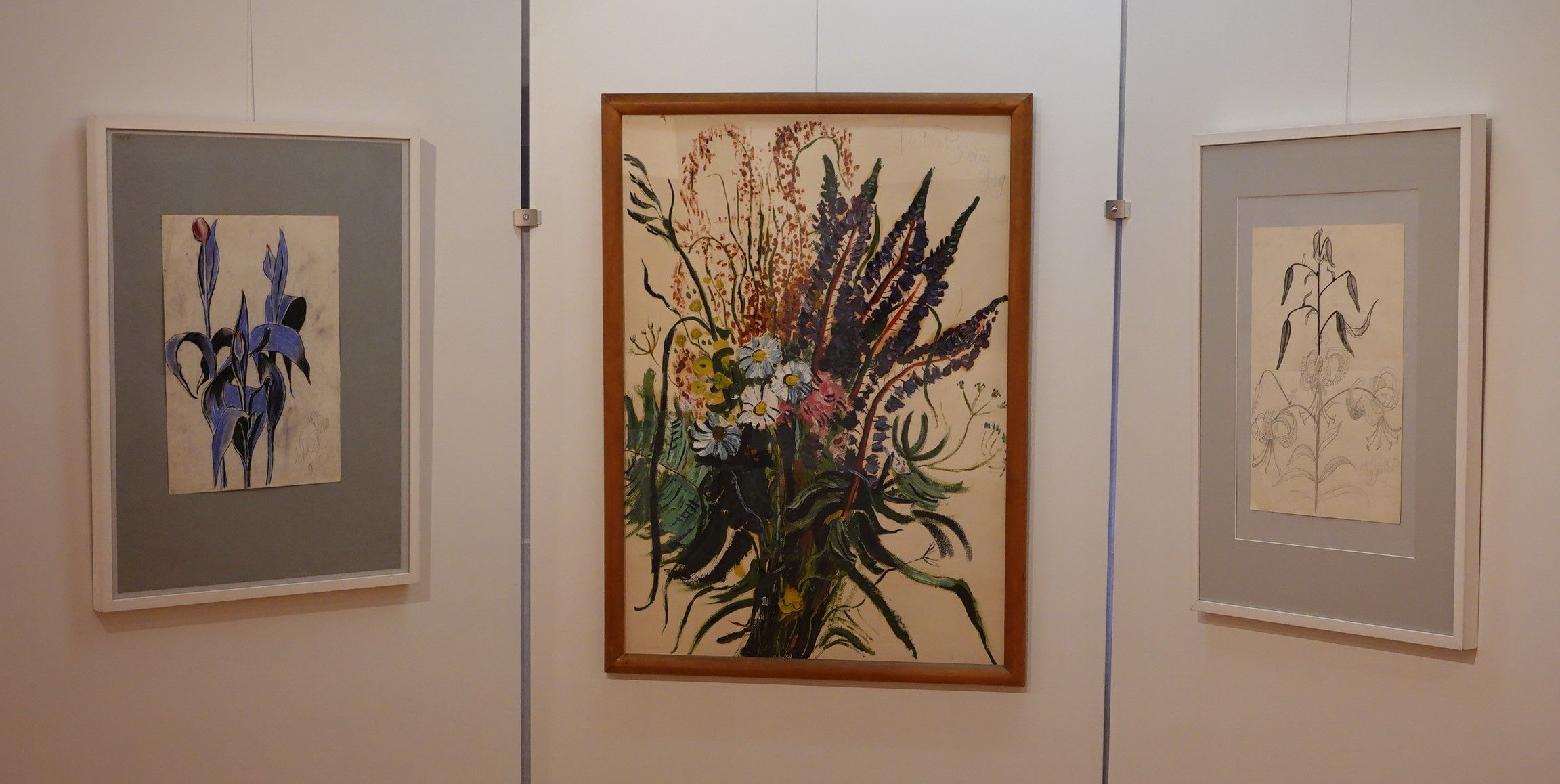 Der Schwerpunkt dieser Ausstellung liegt auf Müllers Blumenbilder der frühen und mittleren Jahre. Eine wirklich frühe, plastische (!) Arbeit ist leider nur noch aus einer Briefpassage Müllers vom 10. Aug. 1928 an Otto Groll bekannt: "Der Frühling. Eine Mädchenfigur in Lebensgröße. ... mit der einen Hand Blumen zudeckend u schützend, die andere einen Strauß haltend. Am Boden aber läuten Maiglöckchen u andere. Die Figur kommt auf eine große Sandsteinbasis in meinen Garten. Heute kann ich schon schwören, unverstanden wird diese Plastik auf die Straße blicken. Ich wollte sie am liebsten in einen Gartenalkoven stellen, mit grünem Hintergrund. Ganz einsam würde sie zu sprechen beginnen – u ich wäre glücklich.“ Stellvertretend für jene verlorene Primavera Müllers zeigt die Ausstellung zwei Skulpturenfragmente aus der Nachkriegszeit (1950/1960).
