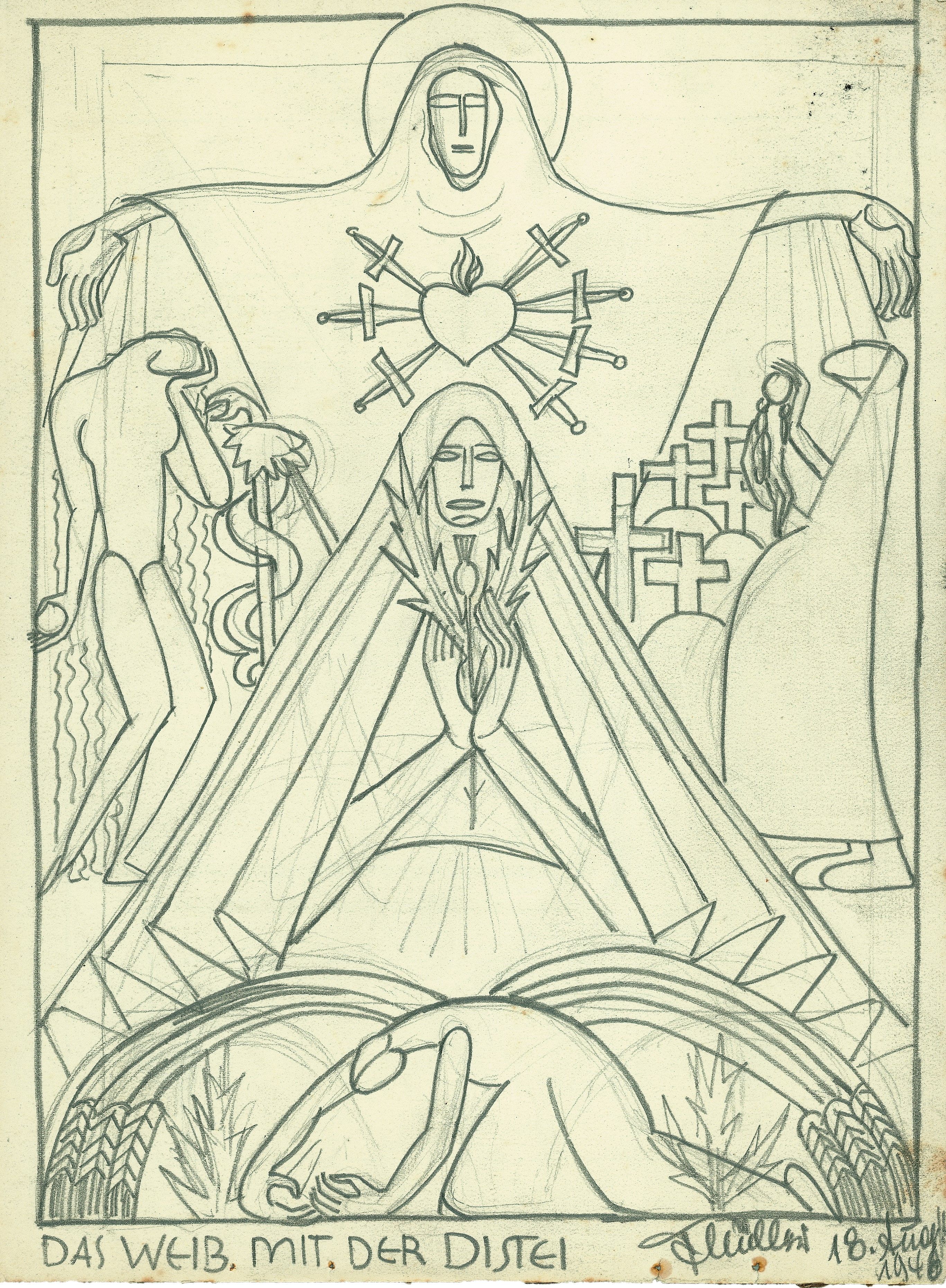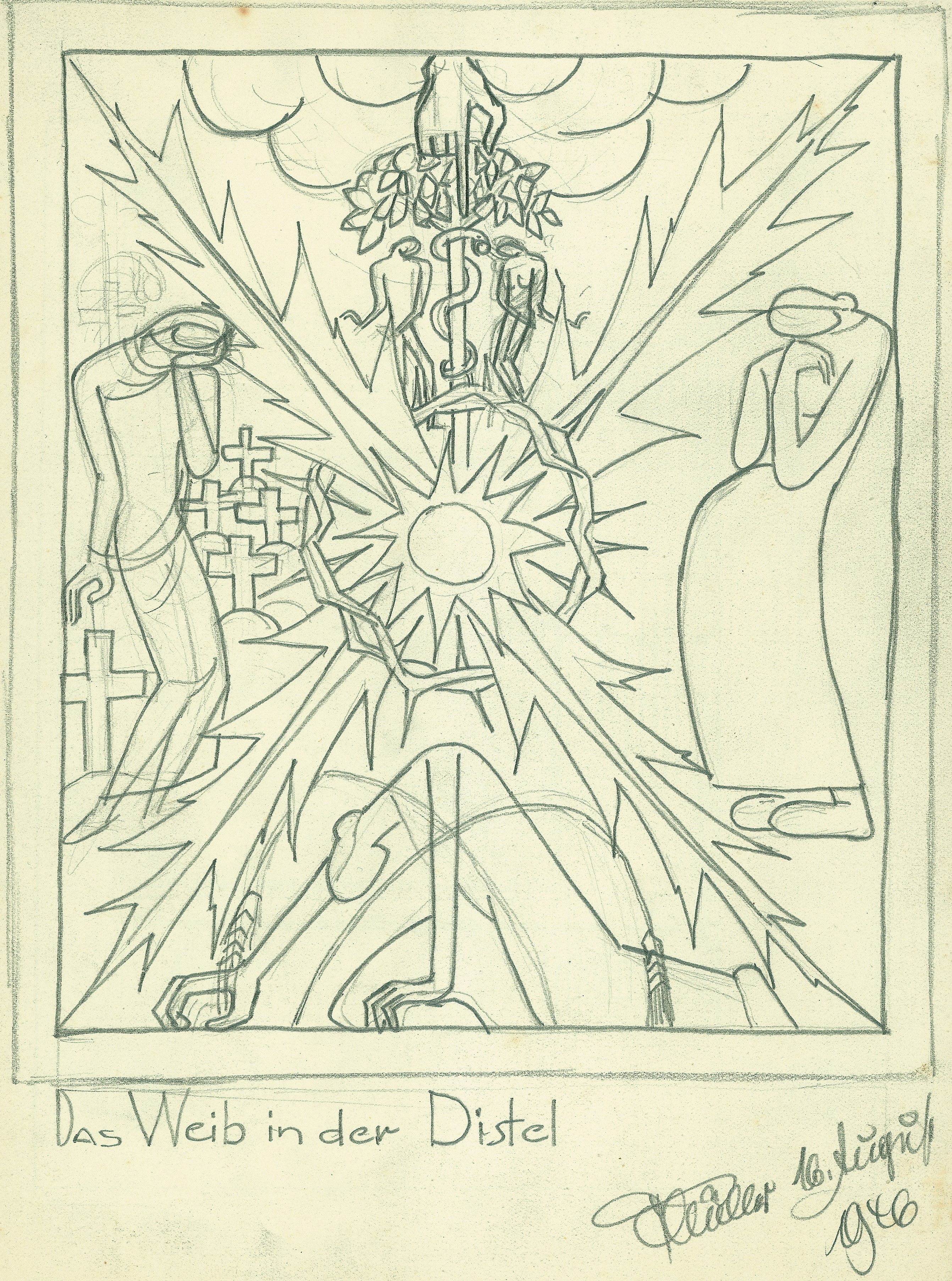 Als Symbolist verwendete Felix Müller Blumen natürlich auch sinnbildlich. So steht z. B. die Distel für das Leiden der Frau als Nachfahrin der Urmutter Eva.