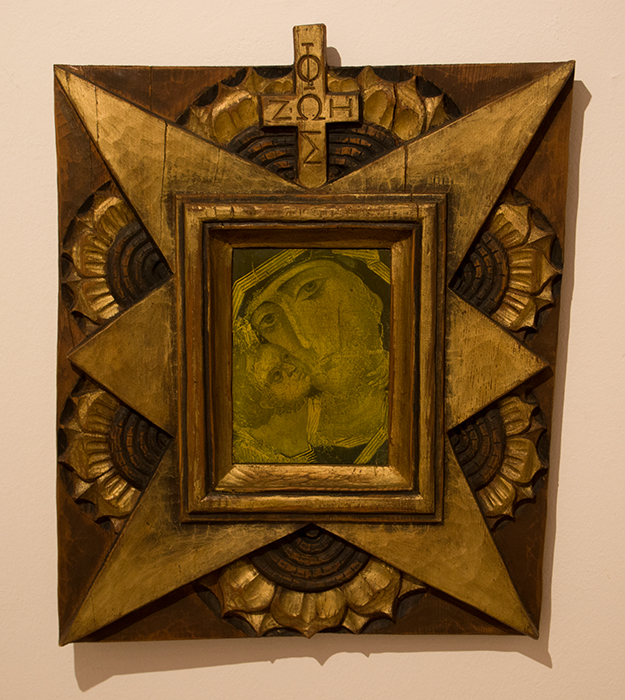 September / Oktober 1943 schuf der Künstler einen kleinen Zyklus zur russischen Passion. Die Zeichnungen wirken viel grafischer, umriss- und geometriebetonter. Zwei von ihnen rahmen in der Ausstellung ein expressives Eichenholzkruzifix. Es stammt aus den 1960er Jahren und wurde 2019 aus Mitteln der Freunde und Förderer des Museums auf einer Auktion erworben. Ergänzt wird das Thema Passion durch symbolistische, plakativ-farbige Gouachen zum Leiden Rußlands. In dem Sujet Mutter und Kind spiegeln sich sowohl orthodoxe Marienfrömmigkeit als auch die Symbolgestalt von Mütterchen Rußland. Für den Druck der berühmten Muttergottesikone von Wladimir schnitzte Felix Müller einen breiten Rahmen aus Sonnenblumen und hing sie so in seiner Neunkirchner Wohnung auf.
